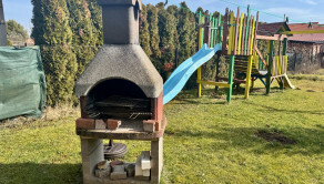 Pozemok je slnečný s ideálnou šírkou. Na pozemku sa nachádza altánok, detské ihrisko, trampolína, krb a ohnisko na opekanie. Parkovanie možné priamo vo dvore (2 autá), pred domom (3 autá) a jedno auto v garáži. Dom je napojený na všetky inžinierske siete: obecná voda, elektrika, plyn, kanalizácia a optická prípojka priamo pred domom.
