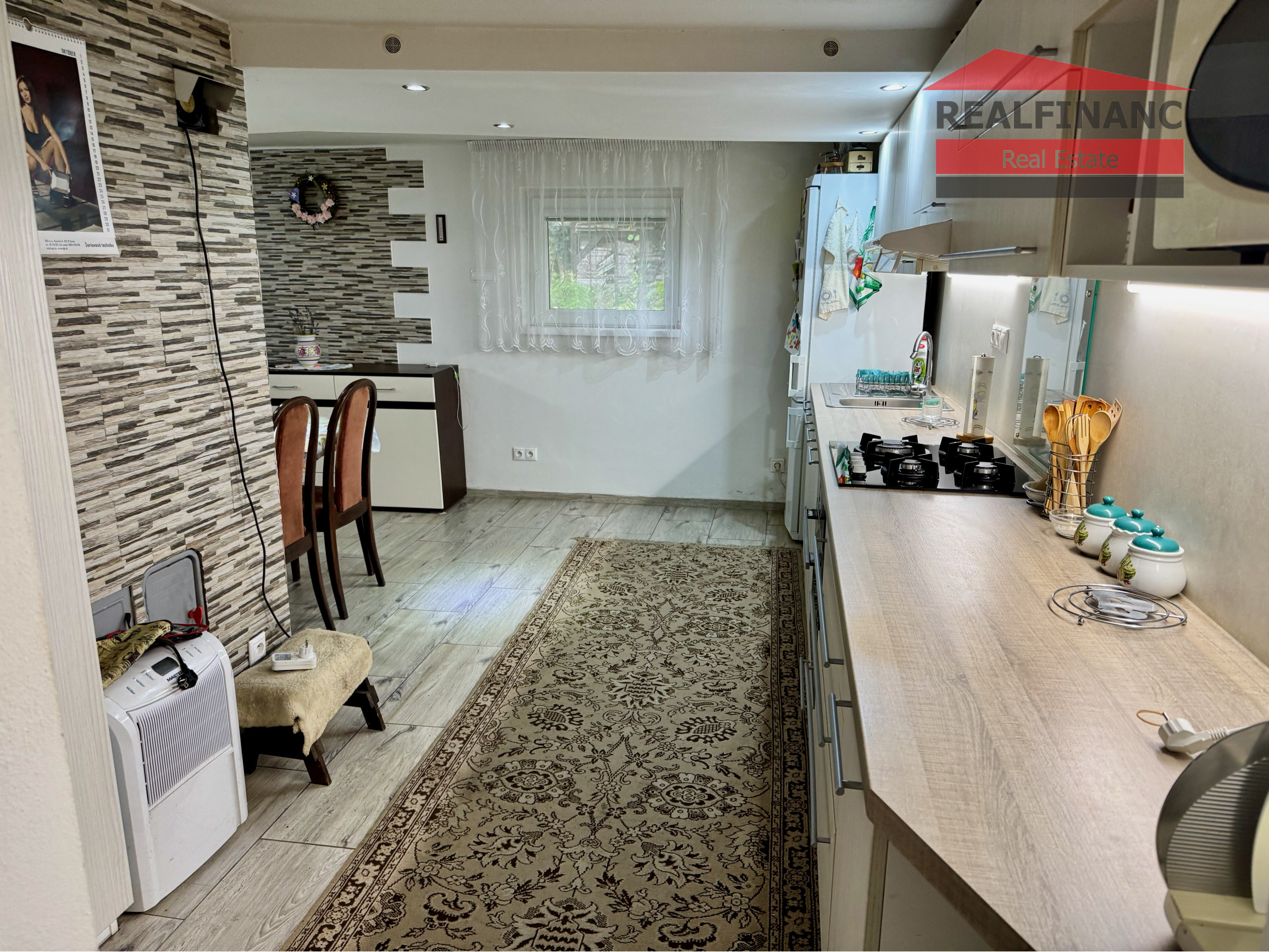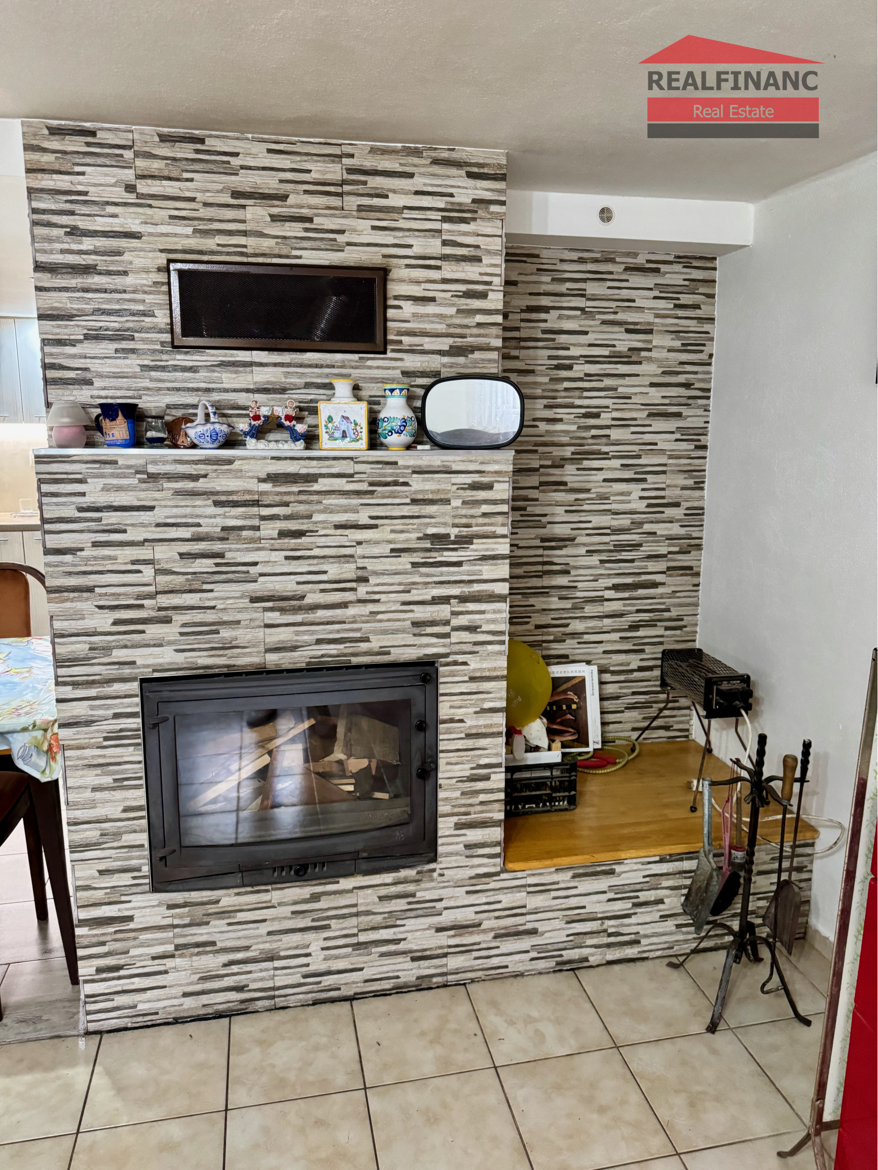 Po vstupe do chaty sa nachádza chodba so špajzou a odkladacím priestorom so vstupom do ďalšej časti, ktorý je využívaný ako šatník. Z uvedenej chodby je vstup do kúpeľne s WC, schodmi na prvé podlažie a vstupom do kuchyne s obývacou miestnosťou, ktoré je oddelené krbom.