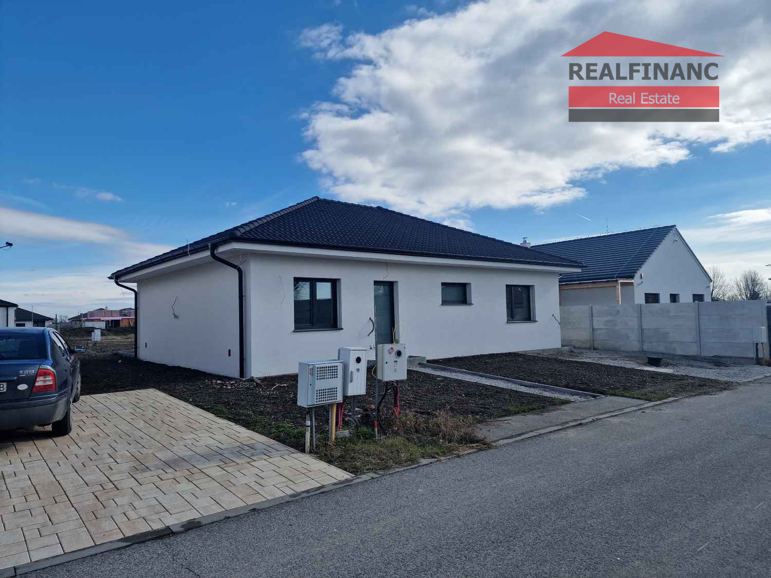 Exteriér: chodník, terasa a 3 x parkovacie miesto so zámkovej dlažby, odvod dažďovej vody, hrubé terénne úpravy a rodinný dom napojený na obecný vodovod, kanalizáciu, elektrinu, plyn + sa pred domom nachádza aj optický internet
