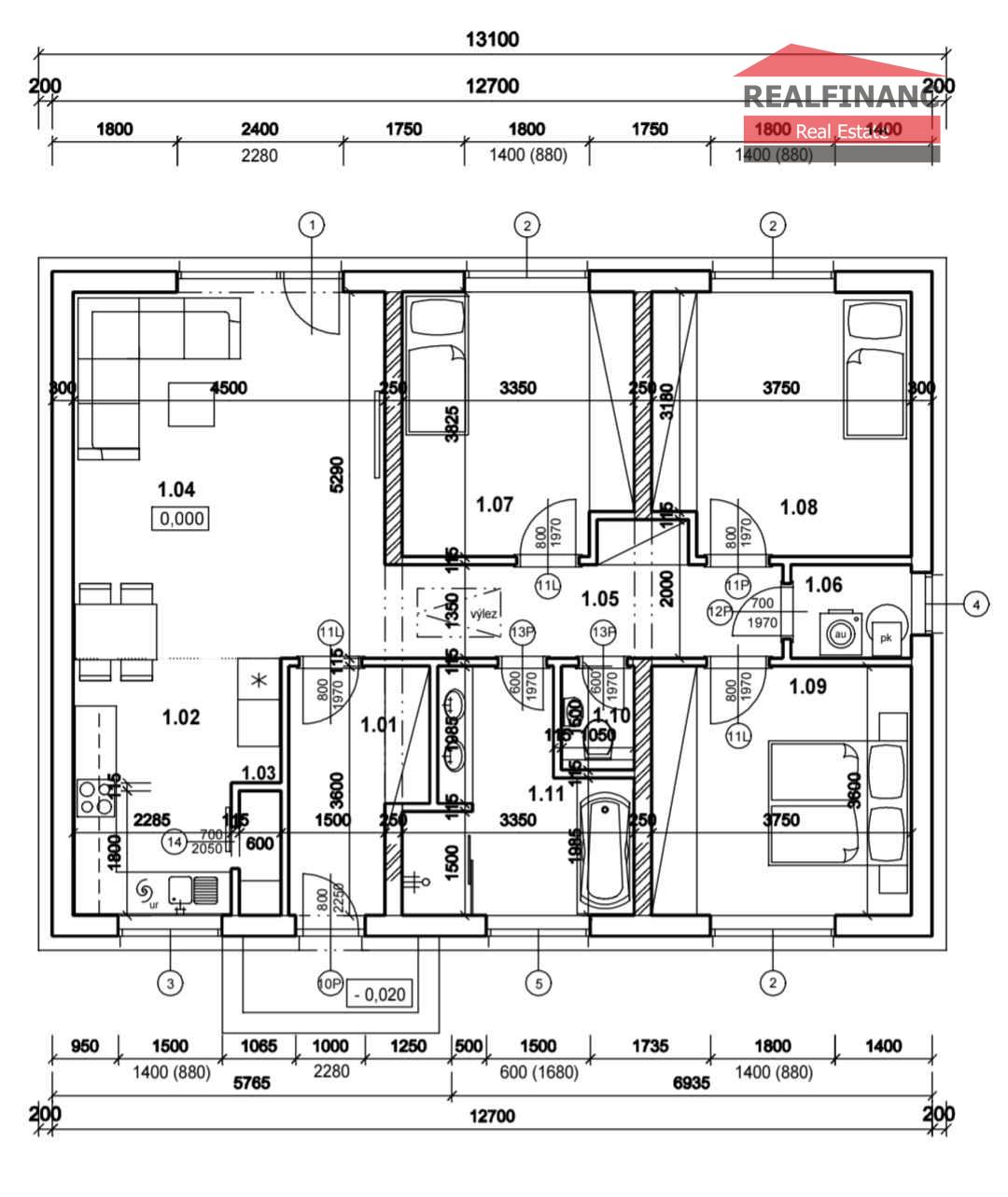 Dispozične pozostáva z vstupnej chodby ( zádverie), obývacej izby prepojenej s kuchyňou, 3 samostatných izieb, špajza, chodba, technická miestnosť, samostatné wc, kúpeľňa s vaňou, sprchovým kútom a druhým wc....